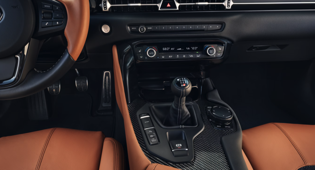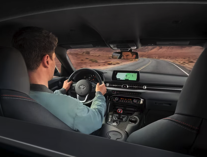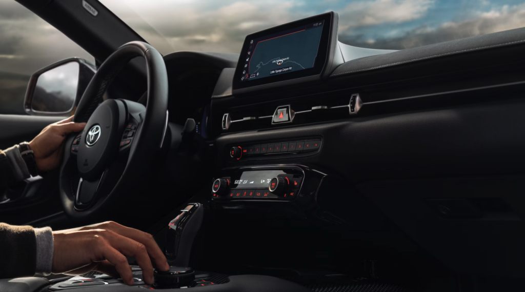 Toyota’s official 2026 GR Supra press materials say all grades come equipped with an 8.8-inch touchscreen display that can also be controlled through a rotary touch controller. That dual-input approach is a small but important detail because it lets the driver operate infotainment with less reach and less distraction. Panama City Toyota also highlights the digital display theme by describing the 8.8-inch high-resolution display in the gauge pod and the three-dimensional tachometer that shows engine speed, gear selection, and other customizable information. Together, those features reinforce the GR Supra’s core identity: this cockpit is built around fast, relevant information rather than dashboard theater.