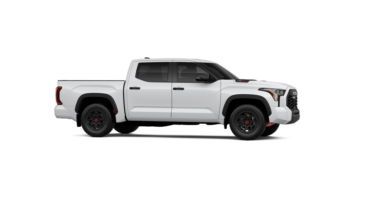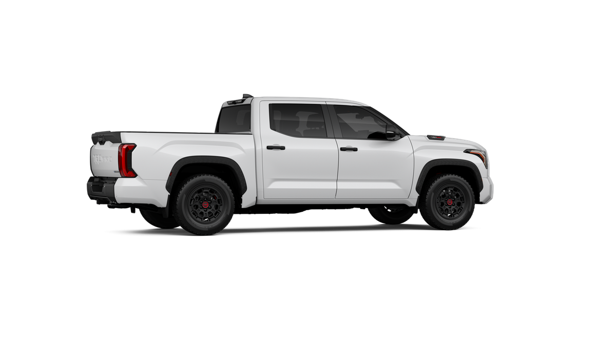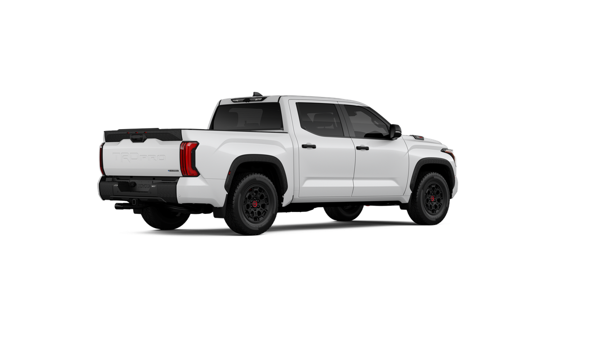 • "TRD PRO" hood badge; black door handles; black window molding and mirror caps; black technical-camo-grained tailgate spoiler and overfenders with marker lights