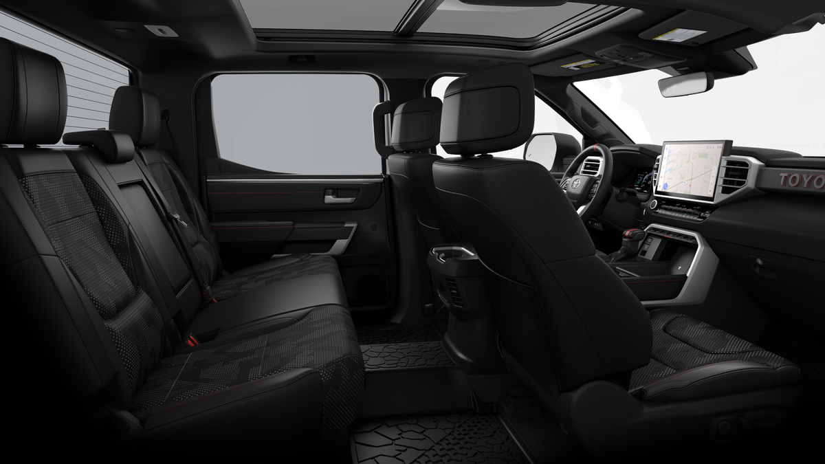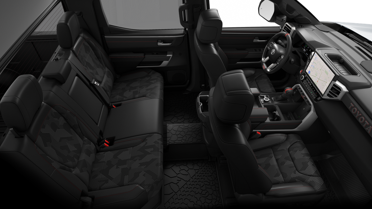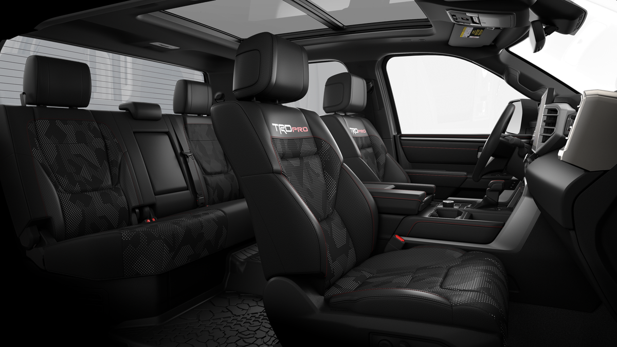 • TRD Pro SofTex®-trimmed seats with contrast stitching and technical-camo-pattern inserts; 8-way power-adjustable driver and front passenger seats with power-adjustable lumbar support